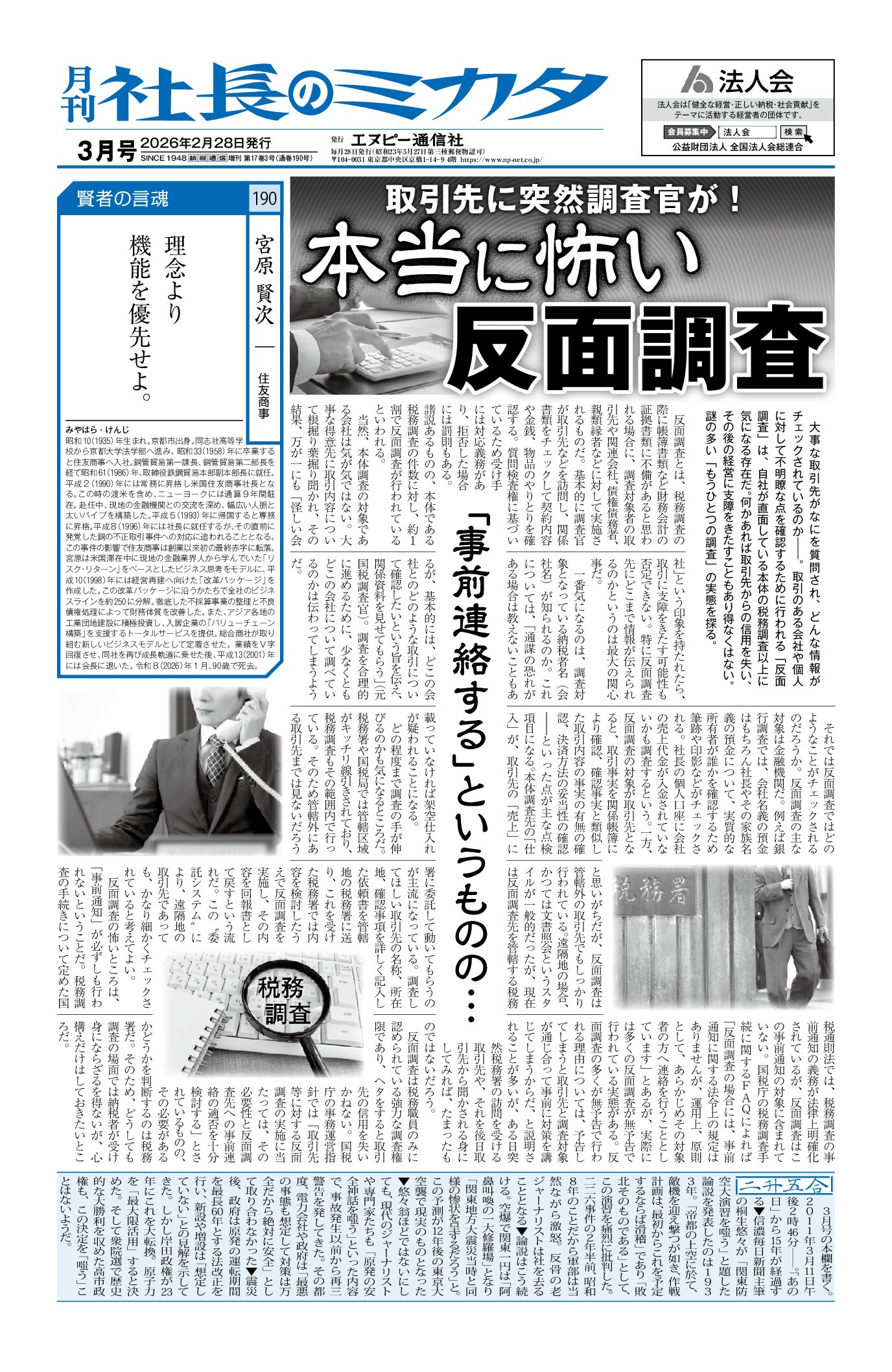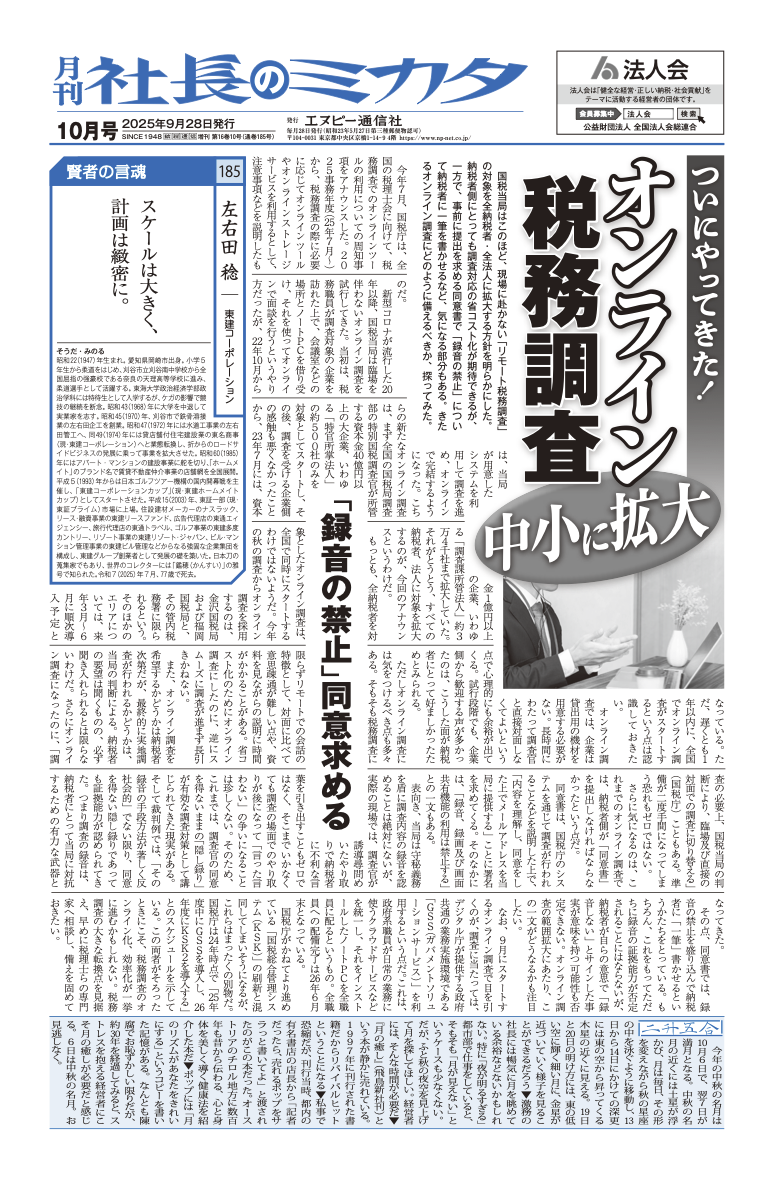 中小企業経営者を対象に、日々の経営に密接する税情報をわかりやすくダイジェストでお届けします。相続税や所得税などに関わるさまざまなヒントや特ダネを掲載。近年は保険会社等が顧問先企業の社長様向けに配布する訪問ツールとしてもご愛読いただいています。顧問税理士だけに頼らず、自力で税知識をアップデートし勝ち残りたい経営者をサポートします。